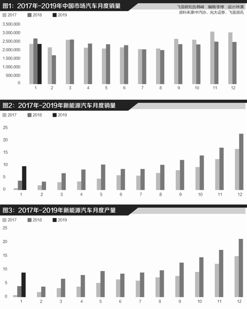 然而在汽车行业整体下行的背景下,新能源汽车却实现强势增长。得益于双积分政策和补贴政策的带动效应,去年全年新能源汽车逆势增长,产量同比增长59.9%,销量同比增长61.7%。今年一月,新能源汽车再交出亮眼业绩,产量同比增长113%,销量同比增长138%,延续去年的高增长势头。(见图2、3)